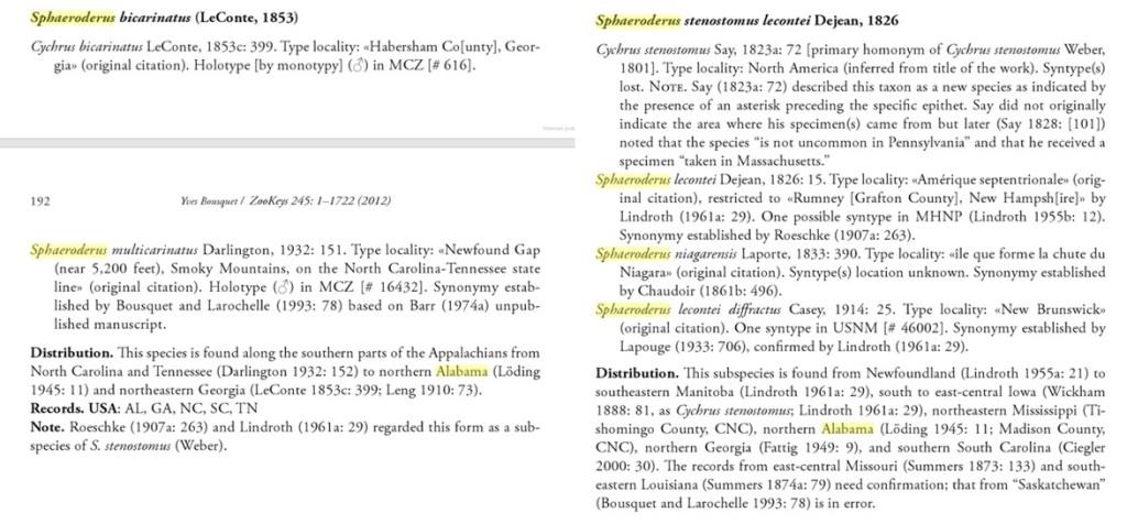 Ho raccolto questo Cychrino in Alabama (USA) sulle sponde del Lake Martin inserito nelle 3 contee di Tallapoosa, Elmore e Coosa. Il coleottero era nascosto sotto la corteccia di un tronco in via di decomposizione