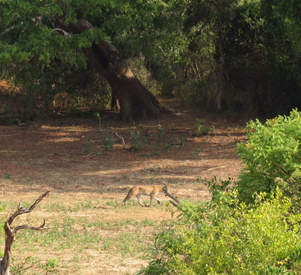 A questo punto stavo fotografando un branco di cinghiali che si spostava in modo piuttosto affrettato, tenendo i piccoli al centro; ho fatto in tempo a rendermi conto che un motivo c’era, e a fare un unico scatto, non del tutto riuscito. Ed ecco Sua Maestà il leopardo, in piena caccia. Che emozione! Ma non dimentichiamo la nomenclatura: Cinghiale indiano – Sus scrofa cristatus Wagner, 1839 e Leopardo dello Sri Lanka – Panthera pardus kotiya Deraniuyagala, 1956.