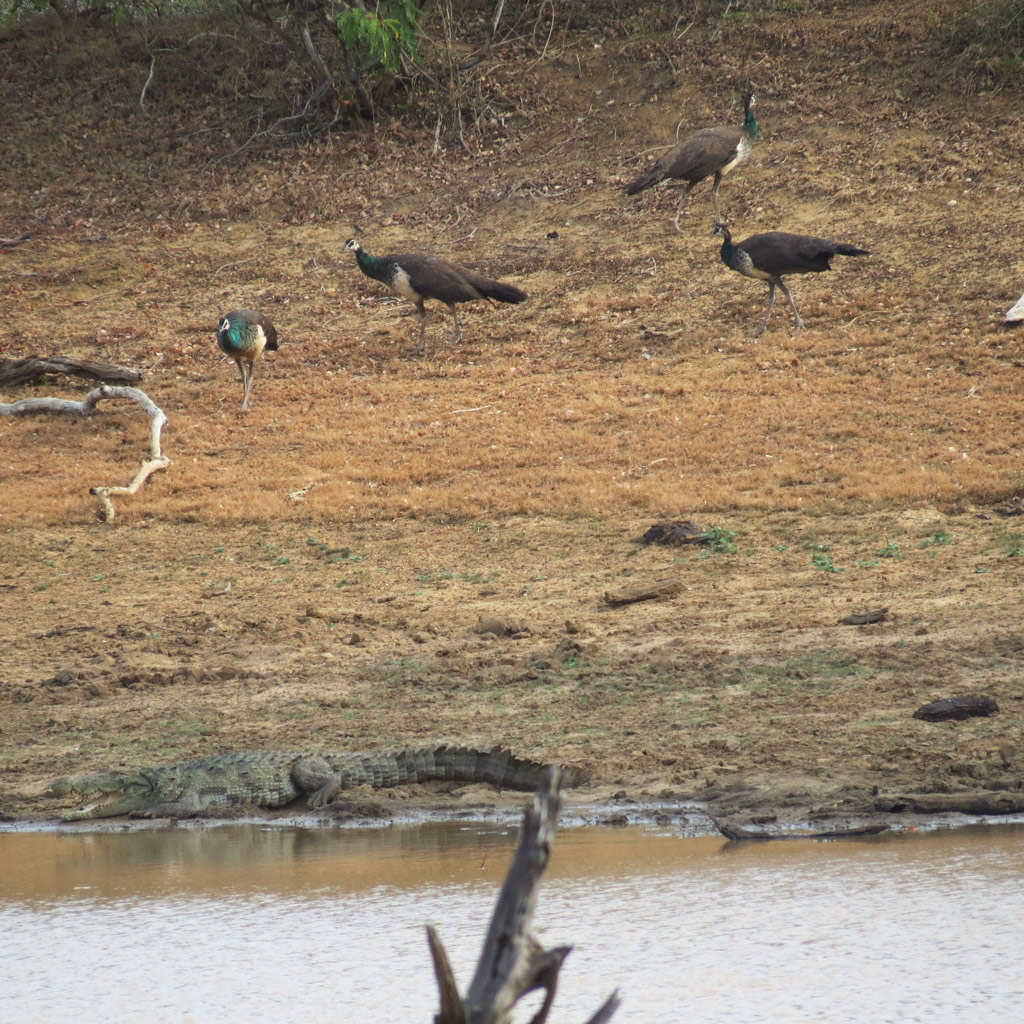 Molto frequenti i pavoni – Pavo cristatus Linnaeus, 1758 – per niente impauriti dai coccodrilli. La specie è originaria dell’India ed è stata portata in Europa dai Romani.