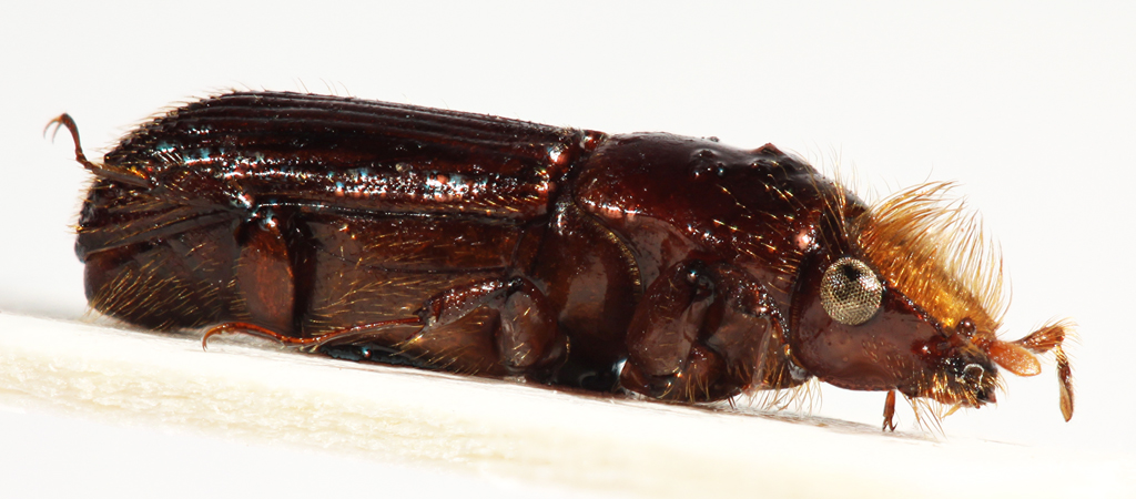 Trafficando con i Platypodidae gabonesi ho ripreso in mano questo e l'ho riesaminato al binoculare. Non mi ero accorto di un carattere curioso, che faccio fatica ad evidenziare con una foto: la parte centrale del capo presenta una vasta depressione, mascherata dal "ciuffo", che va dal bordo di un occhio all'altro. Veramente strana: