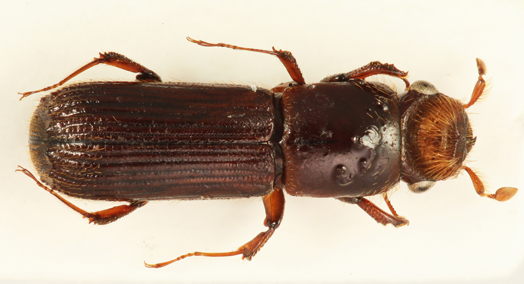 Trafficando con i Platypodidae gabonesi ho ripreso in mano questo e l'ho riesaminato al binoculare. Non mi ero accorto di un carattere curioso, che faccio fatica ad evidenziare con una foto: la parte centrale del capo presenta una vasta depressione, mascherata dal "ciuffo", che va dal bordo di un occhio all'altro. Veramente strana: