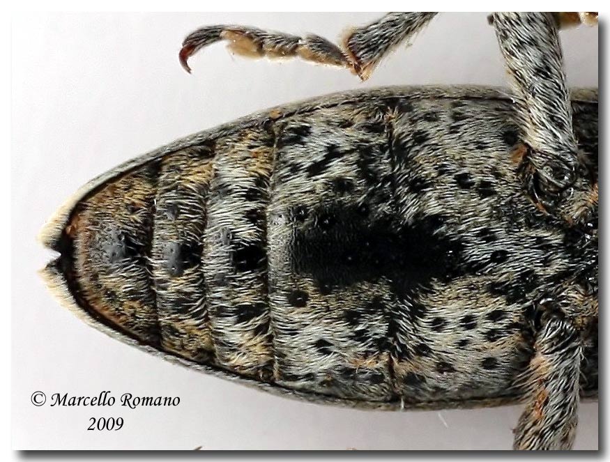 Ho raccolto, presso la Foce del Modione (Selinunte -TP), il 24 maggio scorso, una coppia di Curculionidi. Il maschio (10 mm.) è un po' più piccolo della femmina (12 mm.), ma identico nella livrea. Qui inserisco, per cercare di determinarla, una foto fatta a quest'ultima che presenta una vistosa "cicatrice" sull'elitra destra.