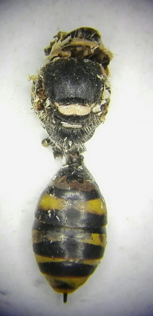 Sono tornato nell'area dove vivono gli agrifogli secolari. Ho sfaldato il legno marcescente di un vecchio tronco morto ancora in piedi. Presentava fori tondi, diametro stimato 4 mm, quindi più piccoli rispetto a quelli descritti all'inizio. Erano presenti gallerie con rosura e, in una di queste, ho estratto i resti di un piccolo imenottero. Perdonate la pessima foto arrangiata col cellulare, ci si può esprimere sulla famiglia? Grazie