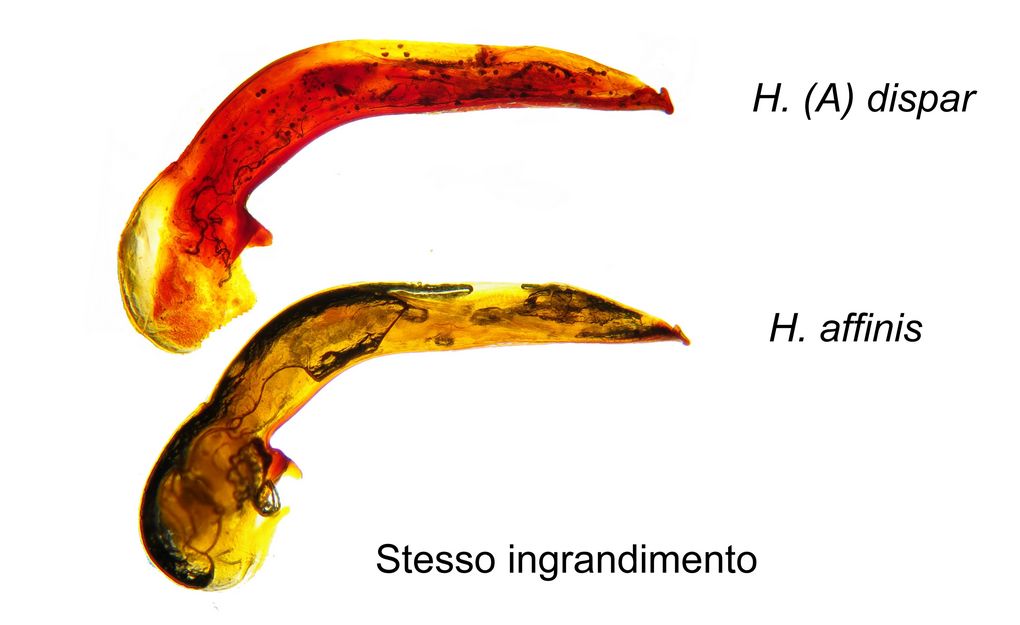 2 - La parte membranosa dorsale dell'edeago nel dispar dovrebbe essere corta la metà che nell'affinis, e non si distingue tanto bene, ma a me sembrano di lunghezza uguale.