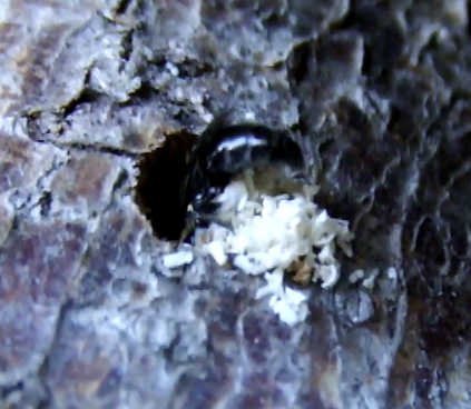 Ciao a tutti! L'altra sera ho beccato un insetto che scavava un buco in un tronco (infilandosi nel buco e uscendo in retromarcia, a intervalli regolari, buttando fuori la segatura); sono riuscito a filmarlo, ma non a fotografarlo, quindi tutto quello che riesco ad allegarvi sono questi fermo-immagine (ho preso il momento in cui esce di più dal buco, purtroppo a conti fatti è mosso e si vede solo il didietro).