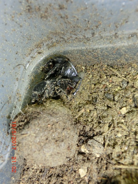 Ecco i primi frutti! Adesso devo portare pazienza e non rompere tutto per osservare la larva. Notare la forma a pera; ho trovato diverse palline sferiche che credo siano solo alimentari, mentre alcune con il collo in cima al quale è deposto l'uovo e da li entra la larva: si intuiva la rosura fatta dalla larva per introdursi nella pallina. Gli esemplari sono stati tenuti in box con terriccio misto a terreno argilloso (qui si vede la sabbia dove ho riposto le pere) ed alimentati con sterco di cane