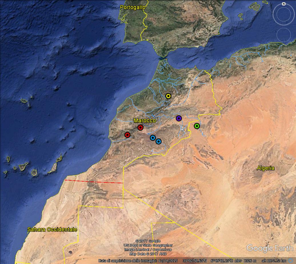 Quasi certamente la violaciocca era la sua pianta ospite. Questo genere si sviluppa, da larva, alla base del fusto (e probabilmente nella radice principale) esclusivamente di Brassicaceae perenni (vive). Le attuali 12 (o 13?) specie conosciute sono quasi sempre indeterminabili da foto, ma se la località dove l'hai presa è lungo la strada che scende a Er Rachidia, potrebbe essere interessante. Questa è la situazione delle Paratassa in Marocco, per quanto ne so io (non tutti i dati sono pubbicati, e ne ho un altro paio che non ricordo al momento, ma la situazione non cambia di molto: cerchio violetto: il tuo esemplare cerchi rossi: Paratassa occidentalis, dell'Alto Atlante cerchio giallo: Paratassa mesatlantica, del Medio Atlante cerchi azzurri: Paratassa agadeziaca, dell'Anti-Atlante cerchio verde: Paratassa coroebiformis, località più occidentale (segue l'Atlante fino alla Tunisia centro settentrionale Le altre specie conosciute vanno dall'Algeria centrale fino all'Iran. Escluderei P. occidentalis anche a memoria, in quanto di proporzioni abbastanza diverse. La agadeziaca me la ricordo abbastanza simile, come pure la coroebiformis. Non ricordo come sia fatta la mesatlantica, che non ho mai trovato, ma controllerò. Purtroppo è una femmina, e non possiamo esaminare l'edeago, che in qualche specie è abbastanza distinto. Nel frattempo, potresti cercare di fare una buona foto allo scutello, che in questo genere è uno dei caratteri utilizzati per l'identificazione?