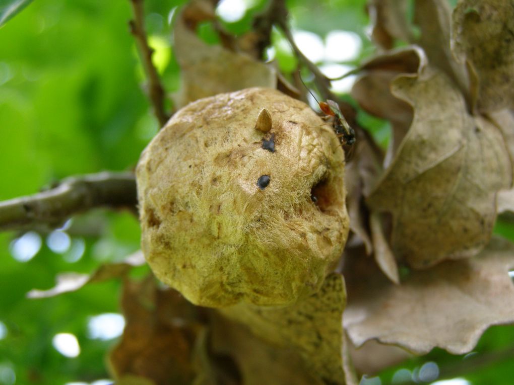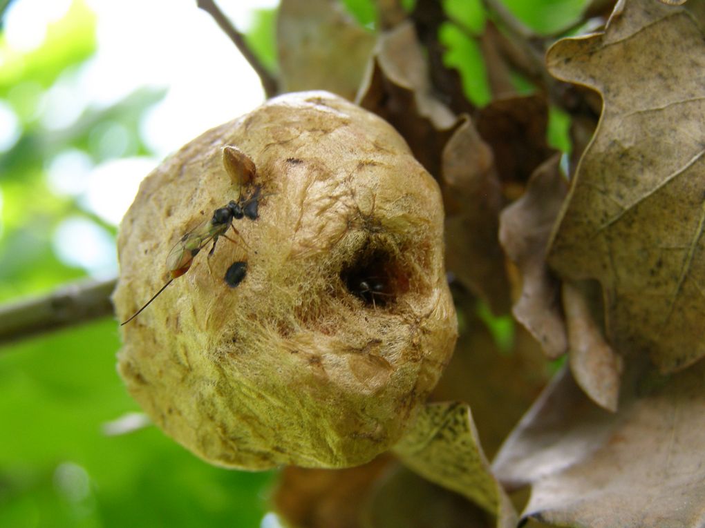Grazie Augusto per l'offerta puntuale di questa bella galla. Si tratta di un Cynipidae: Biorhiza pallida(Olivier,1791) e in particolare quella fotografata è la generazione sessuata di questa specie. La galla è molto vistosa soprattutto per le dimensioni (a volte supera i 5 cm di diametro) e l'abbondanza in annate favorevoli. In questo periodo è prossima a maturare e presto (fine maggio) sfarfalleranno numerosi insettini dalla colorazione marroncina. Ci sono galle "femmine" e galle "maschio" ovvero da talune emergeranno soltanto femmine e da altre maschi. Le femmine con la deposizione delle uova inducono la formazione di galle sferiche e poco visibili perchè sulle radici delle stesse querce. Occorrono un paio di stagioni per completare lo sviluppo e in dicembre-gennaio osservare la nuova generazione partenogenetica e attera salire sui rami della quercia per deporvi le uova nelle gemme ."Eccitate" da questa azione si sviluppano rapidamente nelle galle che ci hai proposto questa sera. Ovviamente la galla molto soffice è appetibilissima da tante specie di parassitoidi che introducono le loro uova nelle cellette della galla e qui la larva parassita divora inesorabilmente la larva (o pupa) legittima. In questa specie pare strategia vincente il numero: infatti per ogni galla vi alloggiano più di 100 insetti e tra tanti qualcuno schiva la terebra del nemico facendosi carico della soprovvivenza della specie... Buonanotte e alla prossima galla...  Salvatore