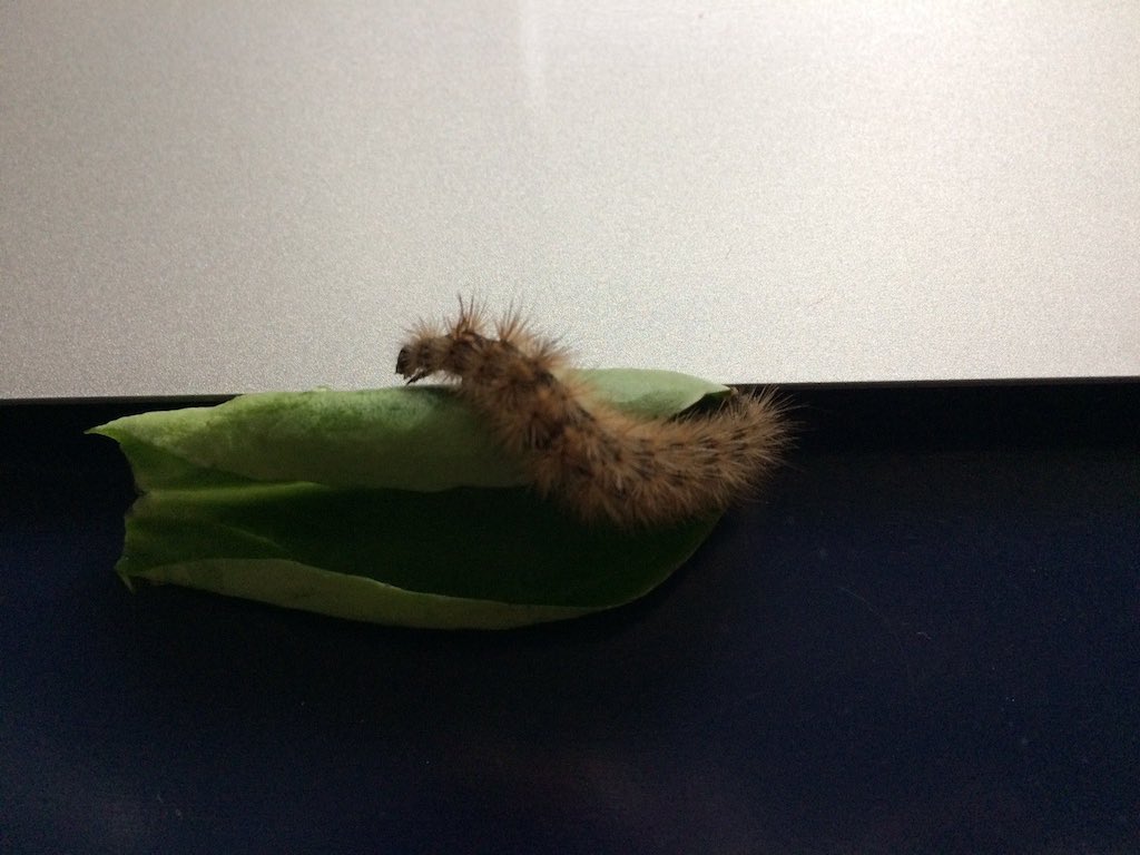 L'ho sistemata in una scatola trasparente, l'ho collocata in un luogo freddo della casa (per simulare la temperatura che troverebbe in natura) ed ho provato a nutrirla con diverse foglie (spinacio, soncino, cavolo, lattuga..), ma non ha mai mangiato nulla. Trascorreva molto tempo immobile (distesa, non arrotolata su se stessa), ma ogni tanto si spostava. Stamane ho scoperto che ha fatto una muta; nella scatola c'è una piccola larva bianca accanto alle spoglie pelose precedenti (di cui allego le foto).
