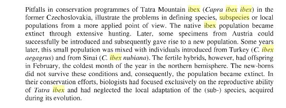 Mi sono letto l'articolo originale (una paginetta). In sostanza. Vi fu una prima introduzione, dall'Austria, nel 1901. L'origine degli individui era dubbiosa, poiché l'esportatore era ben noto per i suoi esperimenti di incrocio sul genere Capra in generale e sugli stambecchi in particolare. Alcuni anni dopo, vi fu una seconda introduzione con individui provenienti dall'Asia Minore e dal Sinai. Le due nuove entità si riprodussero con lo stambecco, modificandone l'aspetto generale ma anche la fisiologia, risultata fatale per il ceppo autoctono; a causa dell'interazione genetica di ibex x hircus x nubiana, infatti, la stagione riproduttiva degli stambecchi di Tatra passò dall'inverno alla tarda estate, con conseguenti parti a febbraio-marzo, quando ci sono tempeste di neve e temperature ampiamente sotto lo zero. Quindi, di generazione in generazione, la prole morì. Tralascio il resto.