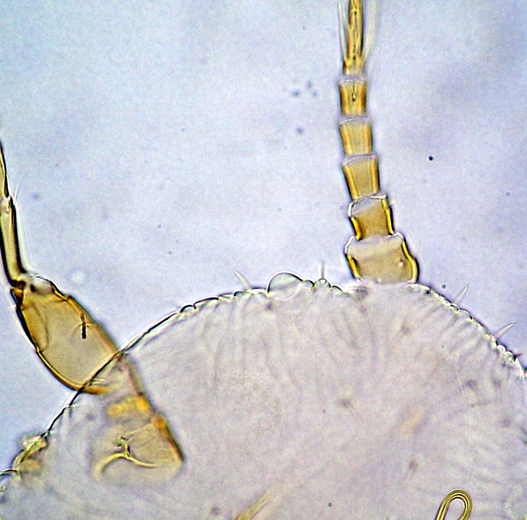 Si possono poi osservare un paio di occhi semplici, due paia di stigmi respiratori (il primo dietro le zampe anteriori, il secondo appena posteriormente a quelle mediane), dei tarsi provvisti di unghie specializzate (quelle dei tarsi anteriori con una sola unghia, quelli dei tarsi mediani e posteriori con due unghie) e di setole altrettanto specializzate che ho poi scoperto essere molto importanti per l’adesione sull’ospite.