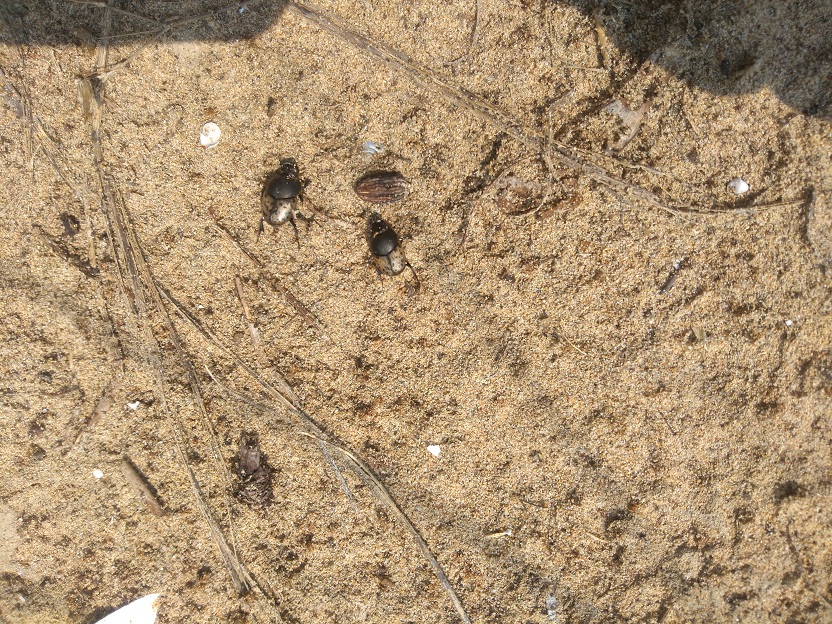 Questa coppietta fa parte di una serie di esemplari che ho avuto modo di raccogliere in ambiente retrodunale - questo Palaeonthophagus, da quanto ho letto, è proprio amante di zone secche e di suoli sabbiosi. La prima volta che li ho trovati (ero parecchio inesperto) ho pensato che fossero abbastanza banali visto che, in un'area piuttosto limitata, erano presenti in abbondanza. Direi che erano i coprofagi dominanti nell'ambiente insieme ad Ateuchetus semipunctatus (Fabricius, 1792) - quest'ultimo però piuttosto raro -, perché per qualche anno non ho visto nessun'altra specie di Scarabeini. Nella zona il pabulum più abbondante erano gli escrementi di conigli (o lepri?) e, essendo a pochi passi da una spiaggia piuttosto frequentata, le immancabili cacche umane.