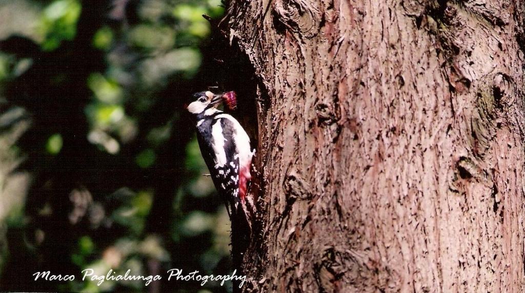 Circa 10 min e niente,inizio a pensare che sia troppo sospettoso,io sono praticamente in un silenzio tombale e fermo come una roccia.All'improvviso sento e intravedo,da sotto il telo(l'unico buco è quello per il teleobbiettivo della macchina fotografica)uno sfarfallio di ali.E' lui!!Un maschio di Picchio rosso maggiore (Dendrocopos major) con una macchia rosso fuoco nella nuca.Bellissimo.Si è agganciato al cipresso dal lato opposto e adesso stà girando davanti a me,a portata del mio campo visivo,sotto il buco del nido.I piccoli l'hanno già sentito e sono in fermento,ma lui aspetta guarda in alto,in basso,a destra,a sinistra,solo quando si sente sicuro,inizia a imbeccare.Due,tre,quattro volte dentro e fuori...ma quante bocche ci saranno lì dentro?(da 4 a 7 uova ho letto).Dopodichè entra e dopo qualche secondo si affaccia con nel becco gli escrementi dei suoi cari pullus e parte come un fulmine.