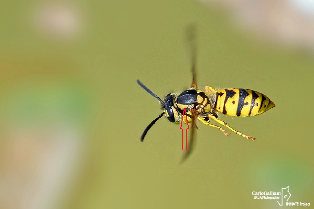 ho trovato un nido di Vespula germanica ideale per fotografare le vespe in arrivo e partenza in buona sicurezza. Vista la macchia triangolare sul torace direi germanica ma chiedo conferma. Ho usato un 200 macro e un 300mm normale e tre sessioni di due ore nelle mattinate di 14-15 e 16 agosto. Ne ho molte altre da sistemare ma già queste rendono bene