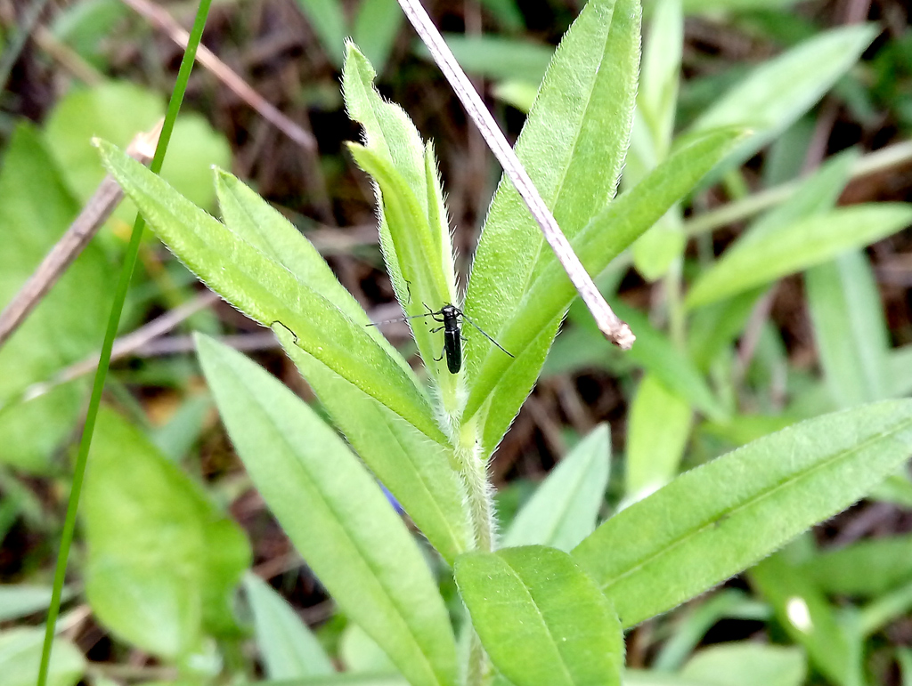 riprendo una discussione su questo non comune cerambicide, discussione iniziata da un post di Conan del 18.VI.2012 su questo forum e rimasta un pò in sospeso. La primavera scorsa ho avuto modo di ritrovare la bestiola e di scattare qualche pessima foto col cellulare della pianta ospite, Lithospermum purpureo-coeruleum, pianta alta circa 30/40 cm. dai piccoli fiori azzurri a forma di calice e dalle foglie lunghe e lanceolate. Poche le piante con i fiori rispetto a quelle presenti sul terreno che formano spesso dei veri tappeti erbosi. Nella foto dell'habitat (margine di boscaglia mista vicino alla strada) compare anche l'amico entomologo Adriano Migliorini che mi ha aiutato nella ricerca e che ringrazio.