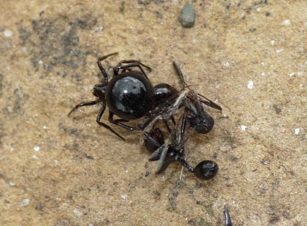 Allego due foto di ragni predatori di formiche. Euryopis forse ha una cerca somiglianza con un addome di formica nera, ma Zodarion somiglia poco.