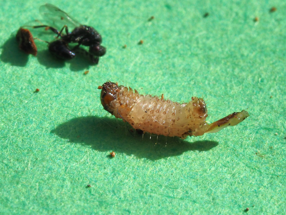 Non è detto che Eurytoma sp. abbia parassitato la larva di cinipide contenuta nella galla di Andricus quercuscalicis, perché in una galla ho rilevato tre o quattro larve di Lepidotteri (Tortricidae), di cui uno parassitato, dei quali allego immagini. Stamane ho trovato, insieme a Eurytoma, anche un nuovo parassitoide, presumo [i]Eupelmus urozonus[/ia] che mi è scappato dopo pochissimi scatti fotografici poco significativi.