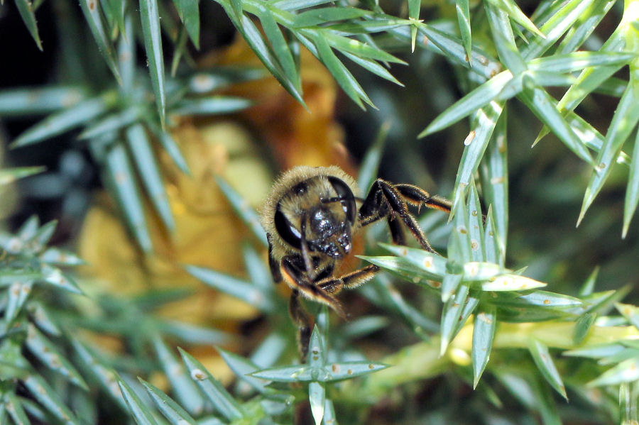 Avendo visto che si posava e poi spariva tra i rami di un ginepro che si trova subito di fianco, osservando bene ho notato una forma gialla in mezzo ai rametti.