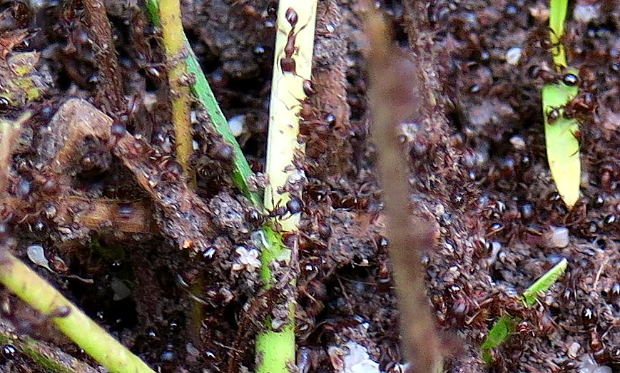 piccolissime formiche fotografate all'imbrunire mentre il formicaio era in allarme. Purtroppo non ho immagini migliori. Grazie in anticipo