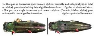 Nel documento che ti ho citato nel primo messaggio ci sono le chiavi dicotomiche. Questa è una femmina, avendo le chiazze sulle elitre. Per capire se si tratta di opulentus o viridissimus devi guardare se il pronoto è pubescente o meno. Terrei comunque un cf. dato che gli Agrilus da foto sono sempre ostici, e come se non bastasse sono molto poco conosciuti. Potrebbe anche essere una nuova specie, senza una analisi effettuata di persona non dico nulla di certo, non avendo peraltro molta familiarità con l'Agrilofauna australasiana.