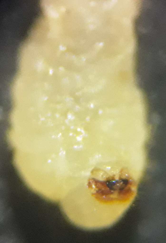 Avrei anche due immagini di una larva, sempre trovata nello stesso campione dove ho trovato il primo esemplare, ma è priva di zampe, (non so se le ho danneggiate io durante la manipolazione, oppure sono ancora in formazione :?
