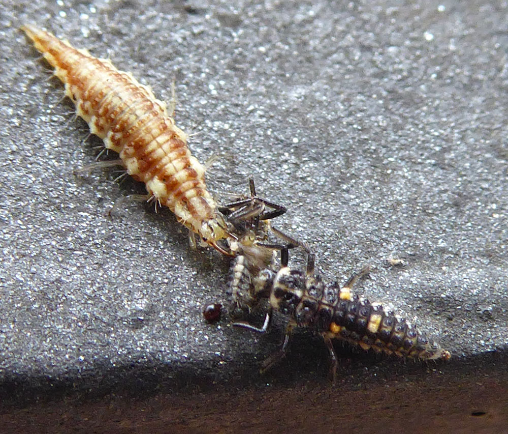 Buondì! Sulle mura di Lucca ho avuto modo di fotografare queste due larve (crisopide e coccinellide) che condividevano un pranzetto (o almeno io così l'ho interpretata).