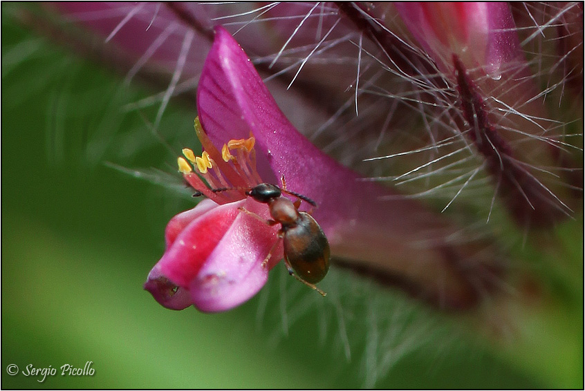 Archiviando foto di fiori di Trifolium rubens ho notato che in un fiore alla base dell'infiorescenza era presente un insetto che per le sue piccole dimensioni non avevo osservato. Essendo abbastanza nitido ho provato ad isolare il particolare e andando alla ricerca per immagini ho trovato una buona somiglianza con il coleottero Anthicidae Microhoria fasciata. Potrebbe essere?