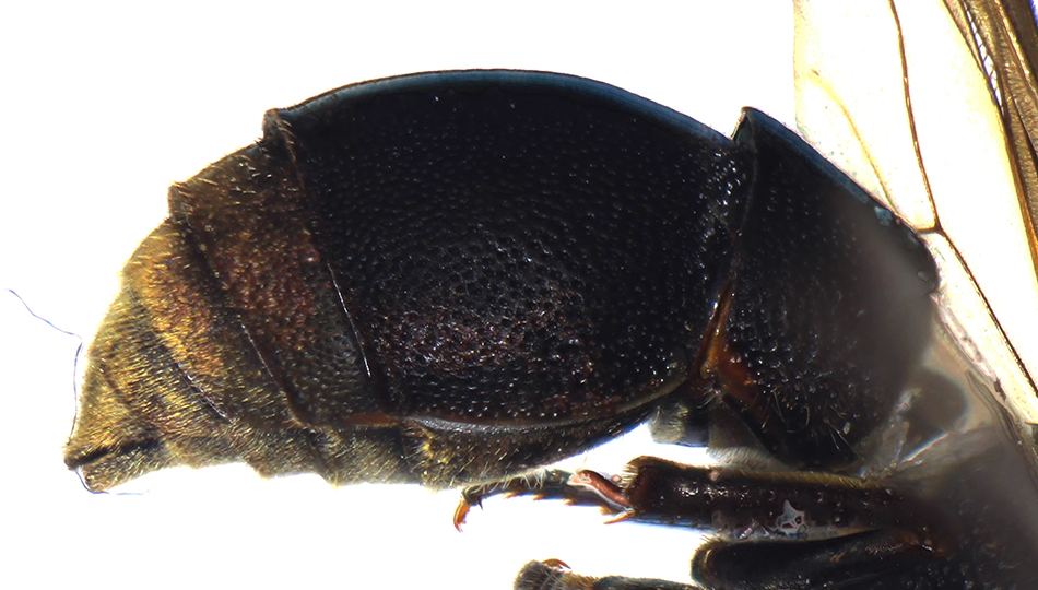 Il Pararrhynchium aurigaster si riconosce immediatamente per la peluria dorata del metasoma, particolarmente evidente sui tergiti dal terzo in poi.