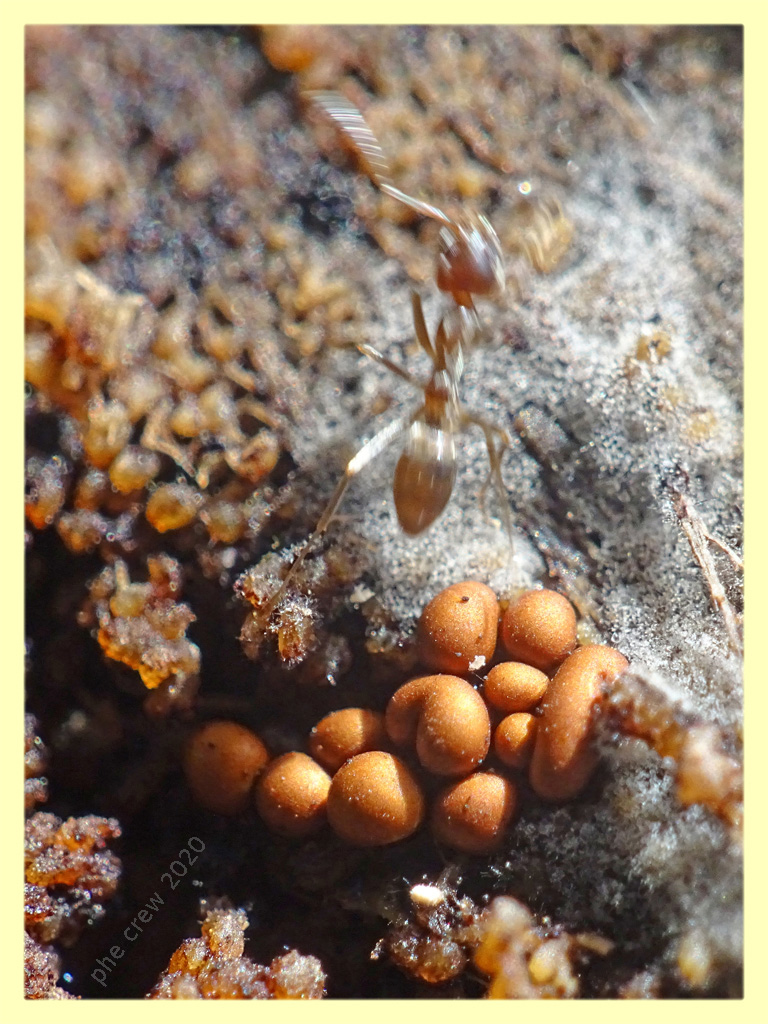 ...scortecciando un tronco di Pioppo trovai una colonia di Formiche, in mezzo ad esse, in gruppi abbastanza consistenti c' erano queste minuscole (forse) uova sparse qua e là. Siccome non le avevo mai viste ho deciso di fotografarle. La misura la si può dedurre dalla prima foto dove c'è una formica che gli corre sopra. Secondo voi sono delle uova, muffa o funghi ?