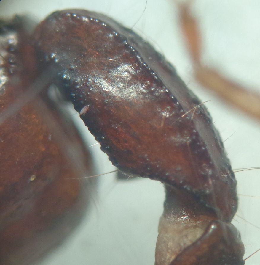 Secondo le chiavi di G. Tropea ed altre a supporto, sarei arrivato a tale binomio per questo esemplare (maschio credo) di mm 23 preso in una trappola dal 8-VI al 15-VII in bosco di faggio; non so se sia un adulto o qualche stadio precedente, vista la esilità del soma. Comunque i tricobotri sono così diffusi: - 4 nel versus della chela: - 6 nel versus della patella; nella parte esterna della patella sinistra le serie di essi sono: - 4 in et; - 4 in est (3 nella destra); - 3 in em; - 2 in esb; - 4 in eba; - 4 in eb. Allego foto anche del 5° articolo del metasoma, anche con dettaglio, quindi dell'esterno della patella, della patella (versus) e della chela (versus). Spero in una conferma opportuna, magari dallo stesso Gioele.