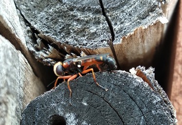 Ho fotografato (malamente) questo piccolo sirfide che non avevo mai visto prima in uno degli insect hotel che ho realizzato occupato da diverse specie di api solitarie (soprattutto da Megachile sicula). Lunghezza di circa 12 mm.