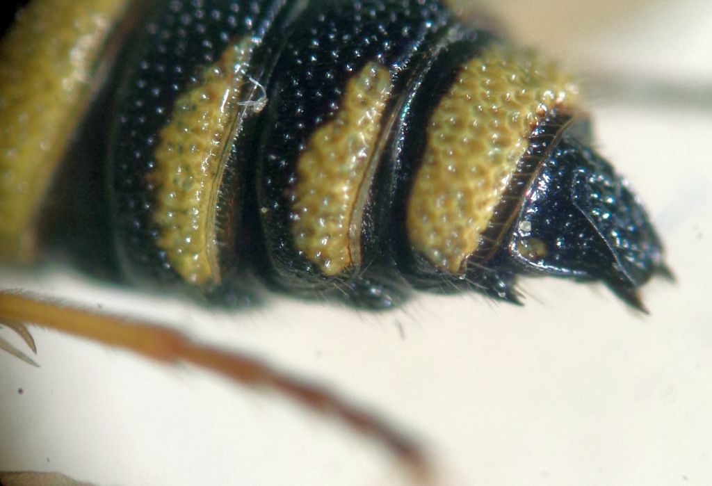La specie non è documentata in dettaglio nel Forum quindi posto questo maschio preso a casa mia sulla solita Ferulago campestris, immersa in una nuvola di piccoli imenotteri e sirfidi; le foto mostrano in particolare i denti presenti all'angolo esterno apicale del 6 sternite e quello più piccolo all'angolo apicale esterno del corrispondente tergite. Mi chiedo cosa prederà la femmina in un ambiente poverissimo di buprestidi: il fiume non è lontano ove potrebbe trovare qualche Coraebus rubi e non so che altri. mm 10.
