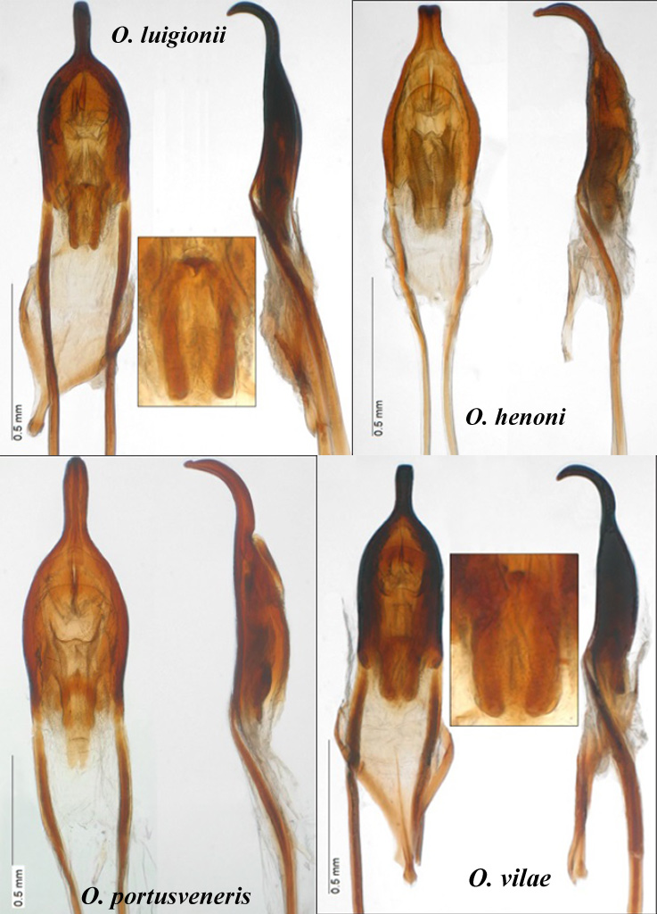 Non mi riferivo alla visione laterale dell'edeago, ma a quella dorsale ed in particolare all'angolo che ho messo in evidenza modificando la tua foto (Vedi sotto). Certo è che la struttura dell'endofallo in questo gruppo è diagnostica e discriminante, per cui io propendo come te per O. vilae ma cercherei comunque di chiarire il carattere indicato in foto.