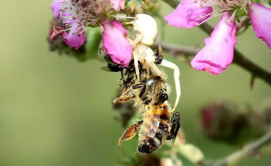 CURIOSITA': mentre una ragno morde la preda almeno 7 piccole mosche zampettano sulla vittima e sul predatore (mi sembra una femmina di misumena vatia). Mi domandavo queste piccole mosche di che specie sono e se è una stranezza questa situazione.