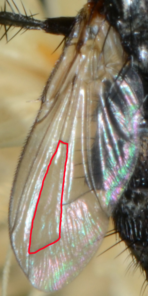 La venulazione alare mi pare che sia da Rhinophoridae, e in particolare la cella qui indicata in rosso,