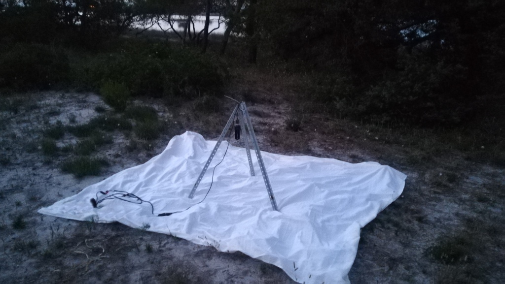 Stamattina ero sul campo per allestire qualche trappola luminosa con interruttore crepuscolare e ho fatto alcune foto. Il metodo è quello già illustrato: bacinella molto bassa interrata a filo di terra con un dito di acqua saponata; lampadina uv a fluorescenza da 20W sospesa con una bacchetta metallica infissa obliqua al suolo; batteria da 20000 mAh collegata al crepuscolare e alla lampadina. Questa l'ho montata stamattina, andrò a ritirarla domani. L'interruttore la farà accendere al crepuscolo inoltrato e la spegnerà all'alba. Ho montato il crepuscolare su un banale cardine preso in ferramenta. Da chiuso è comodo per il trasporto. Altrimenti lo si apre 90° con una pietra all'estremità per dare stabilità. O ancora lo si può aprire a 180° e un'estremità può essere infissa al suolo.