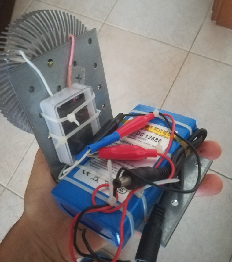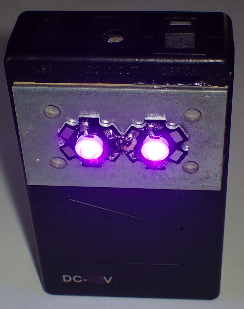 Già che ci sono, vi mostro la mia ultima lampada UV, questa volta ridotta al minimo. Caratteristiche: 6W di potenza, per circa 5 ore di autonomia. Peso 138 g, dimensioni 10,5x6,3x3 cm. Ricaricabile tramite porta usb o alimentatore tra 4,5 e 6V, 0,5-1A Ho aperto il contenitore della mia prima batteria al litio 12v 6800 mAh, che dopo anni si era gonfiata e non si caricava più. Dentro ci sono tre elementi al litio, sigillati separatamente, ciascuno da 4V, 6.800 mAh. Uno era danneggiato, gonfio come un palloncino, ma gli altri due no. Ho tolto tutto il contenuto e ho usato solo un elemento, a cui ho collegato due led UV 3W in parallelo (con una resistenza per ridurre leggermente la tensione), usando interruttore e porta di collegamento elettrico già presenti sul contenitore. Il pezzo più pesante è la piastra di ferro che serve a dissipare il calore dei led, perchè al momento non ne avevo in alluminio. La luce emessa è sufficiente per i nostri scopi, se in zone con scarsa illuminazione.
