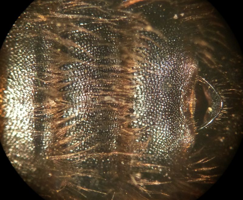 Grazie Pietro. Vedo una depressione arcuata all'ultimo sternite visibile, se "solco" può definirsi. Un crop del metatarso..., che è un po' fulvo e un po' nero: valuta tu.