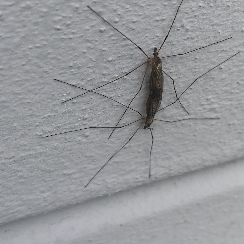 Questi sono ditteri nematoceri, direi Tipulidae. Senza maggiori dettagli non sono in grado di dire di più, e probabilmente sarebbe lo stesso anche con qualche altro dettaglio perché la famiglia è numerosa e la distinzione tra specie si basa spesso su piccoli caratteri non rilevabili in foto.