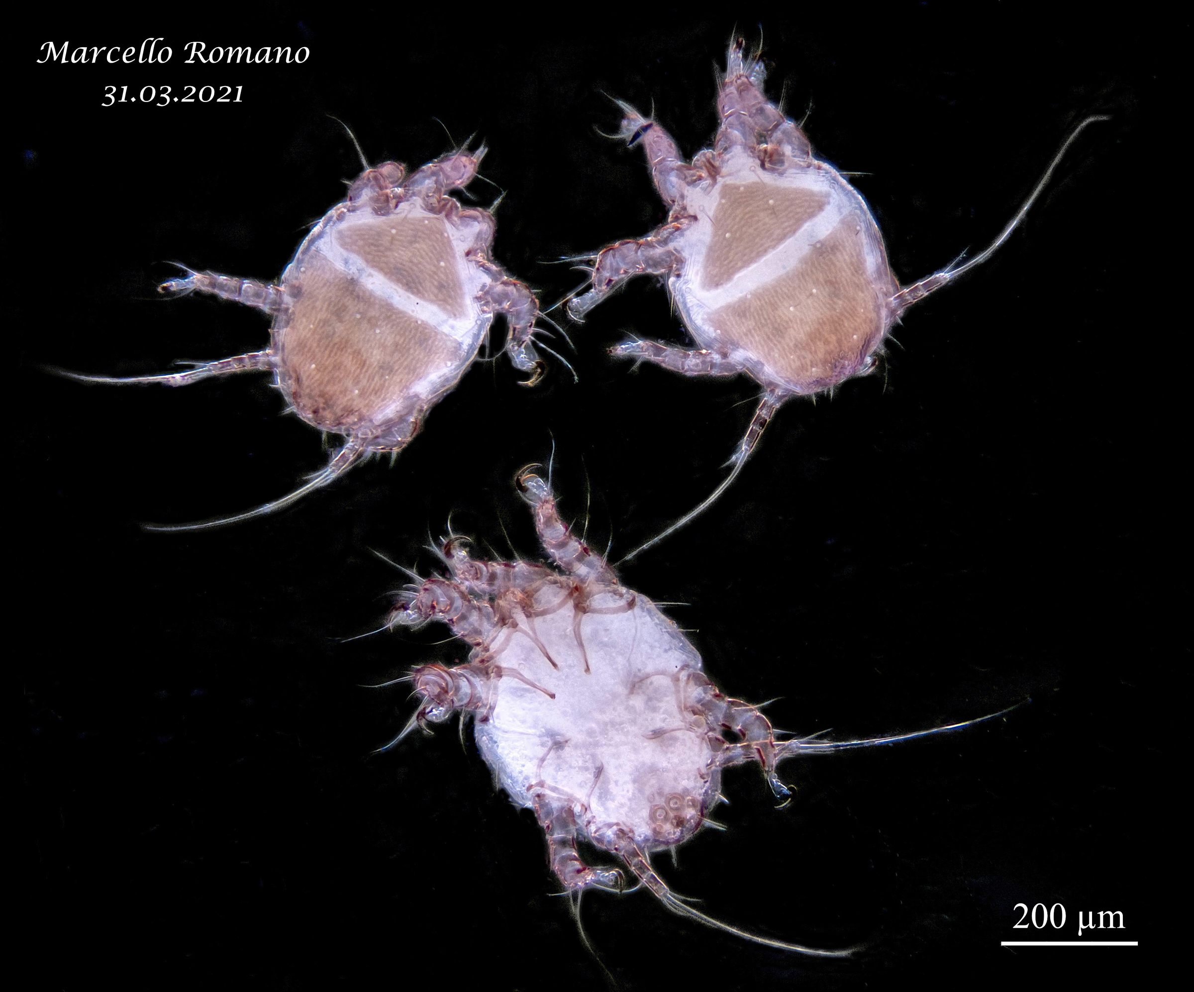 Se l'immagine è ingrandita ulteriormente, si notano anche 2 ninfe attaccate sul primo esemplare a destra e sul secondo a sinistra in alto. Per attaccarsi hanno su ogni zampa un "arpione", visibile in almeno 2 delle zampe anteriori destre sempre del primo esemplare a destra. A questo si aggiunge the sucker plate (postero-inferiore) probabilmente quando vuole fermarsi e mantenere maggiore stabilità. Plumari docet. :D