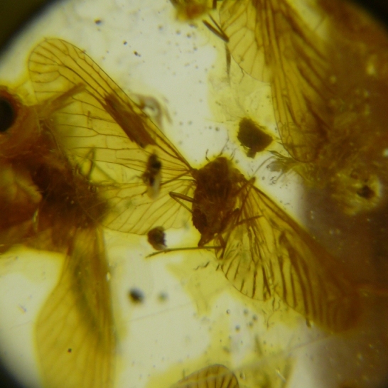 Ho in collezione questo campione di copale e al suo interno ho trovato questo bel gruppo di sette emitteri (0,5 cm misura del corpo).