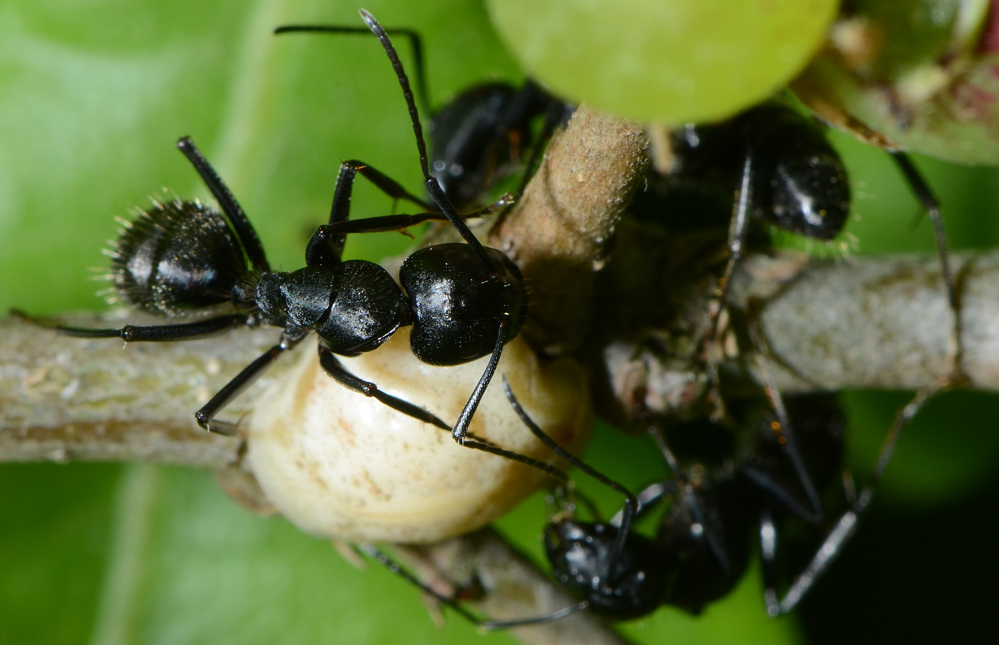 Infatti per le formiche credo di non sbagliare considerandole operaie di Camponotus aethiops (ma naturalmente una conferma è sempre gradita), e fanno l'onesto lavoro delle formiche: raccolgono secrezione zuccherina dalla larva, così come fanno con gli afidi. La larva invece per me è un mistero. Mi ricorda alcune larve di Syrphidae, ma non sono per niente sicuro che lo sia. Non sono sicuro neanche che sia un dittero, così come non ho mai sentito di larve di ditteri che secernono sostanze zuccherine gradite alle formiche. So che lo fanno quelle di qualche Lycaenidae, se non ricordo male.