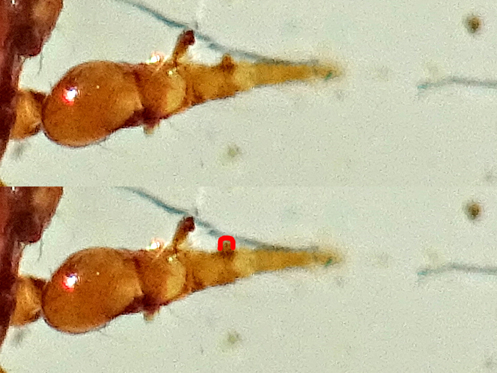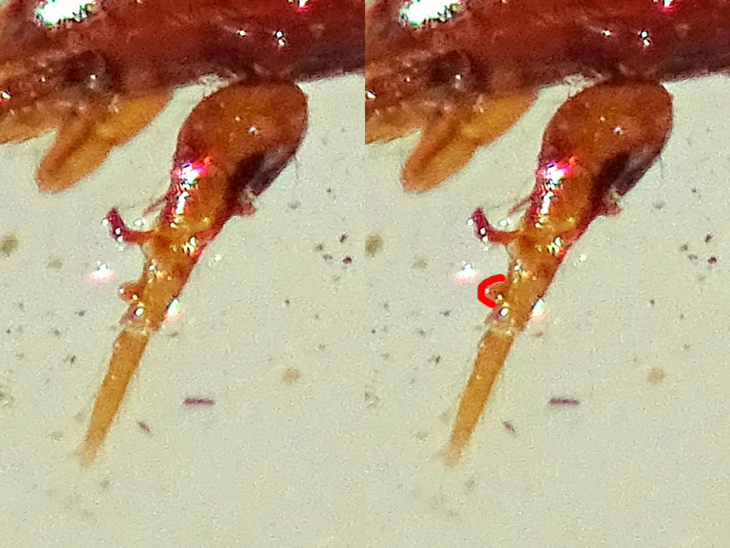 Le foto non aiutano molto.... e bisognerebbe guardare bene la forma delle altre apofisi sulla tibia II (oltre che altri caratteri), ma sulla base della posizione dell'apofisi più distale, a me sembra di più P. crassipes. Immagino che tu abbia preso ispirazione da questa discussione. Se osservi bene l'apofisi distale in P. longicornis è a ridosso del margine anteriore del segmento, mentre in P. crassipes è più arretrata, quasi a metà del segmento. Ad ogni modo, nel dubbio, lascerei maschio di Pergamasus sp. (Acari Mesostigmata Parasitidae).