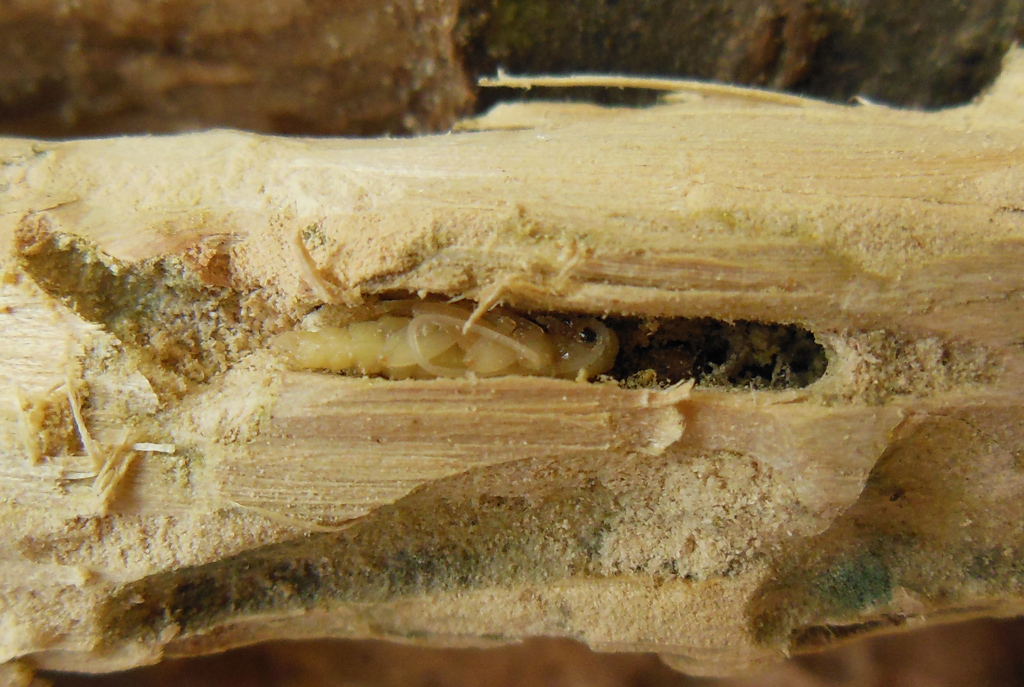 La sua presenza nel veronese mi era stata segnalata da un mio amico entomologo di quei posti che l'aveva allevata da rami di Prunus trovati in terra nel cortile di casa in campagna. Visto che per me è il luogo più vicino per andarla a cercare...ne ho approffitato. La pianta era davvero infestata dalle larve e per questo anche il cleride Opilo si trovava a suo agio.