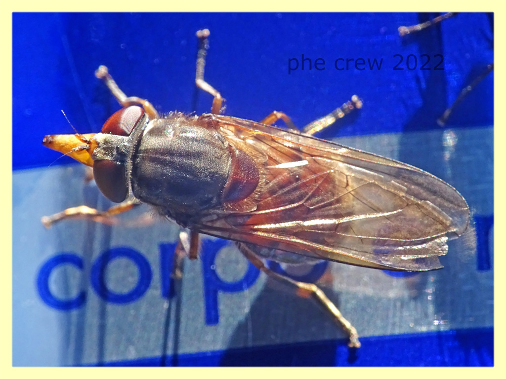 ....comunque riguardo al soggetto leggendo su arthropodafotos.de si riconosce da R.rostrata e R.borealis per avere una cucitura laterale dell' addome nera cosi' come i margini dei tergiti addominali (penso che siano i caratteri principali diagnostici per distinguerla) ha anche sull' addome rosso una striscia mediana nera. 7 - 11 mm., torace con strisce longitudinali spolverate, zampe per lo più rosse, femore alla base nero, tibie con un anello nero.