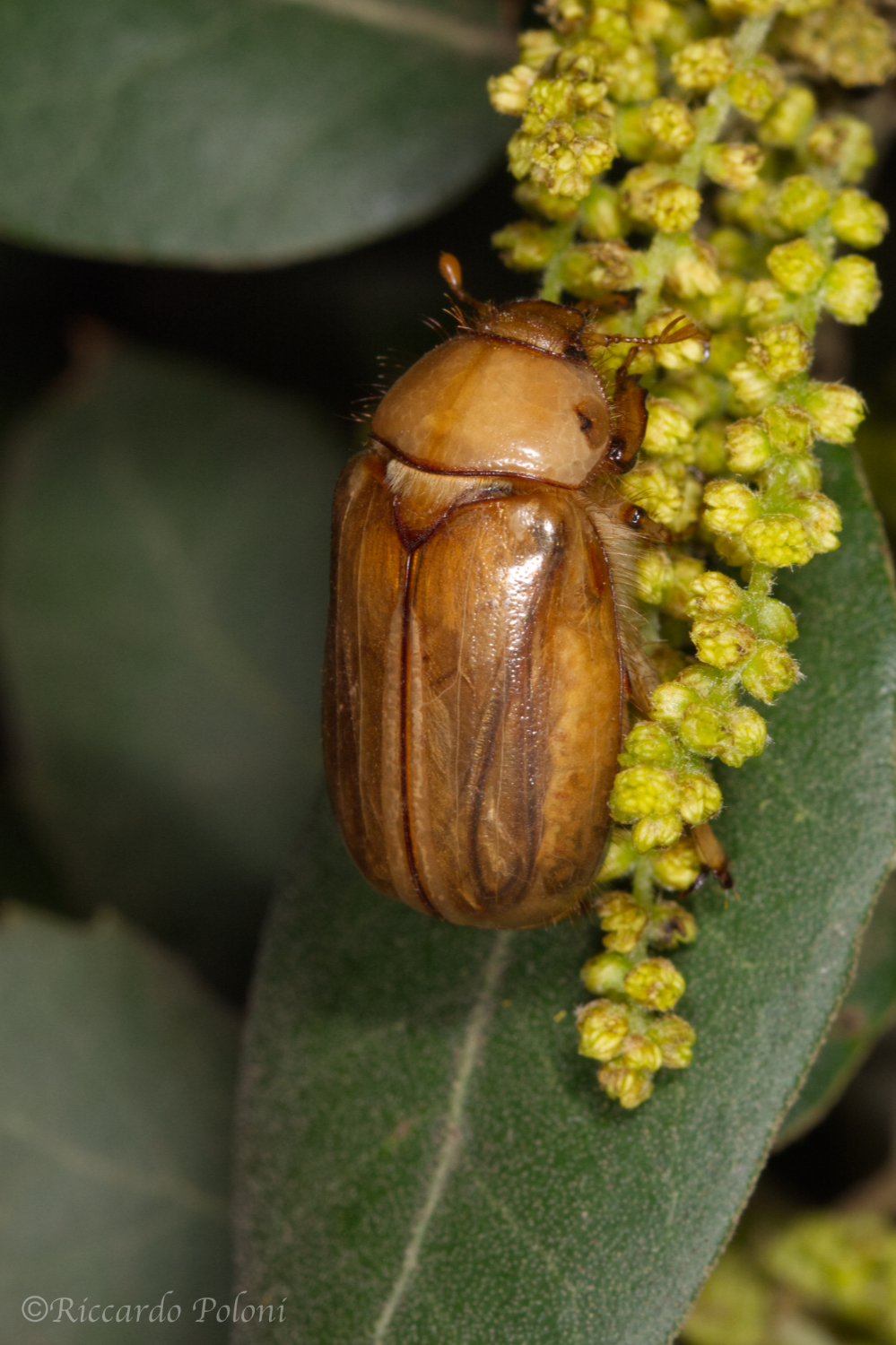 Montato il tutto, comincio, come faccio sempre, a perlustrare i dintorni con la torcia frontale. Sopra i fili d'erba volano piccoli Sericini e, passando sotto un grosso leccio, sento il caratteristico "zz-zz" di un coleottero che si alza in volo. Puntando la torcia in direzione del suono riesco a prendere uno e poi due Rhizotrogini che svolazzano goffamente in mezzo all'erba per poi scoprire che la quercia è letteralmente invasa dagli scarabeidi e che, tra sericini e Rhizotrogus, è tutto un svolazzare. Con il retino raccolgo una bella serie di entrambi.