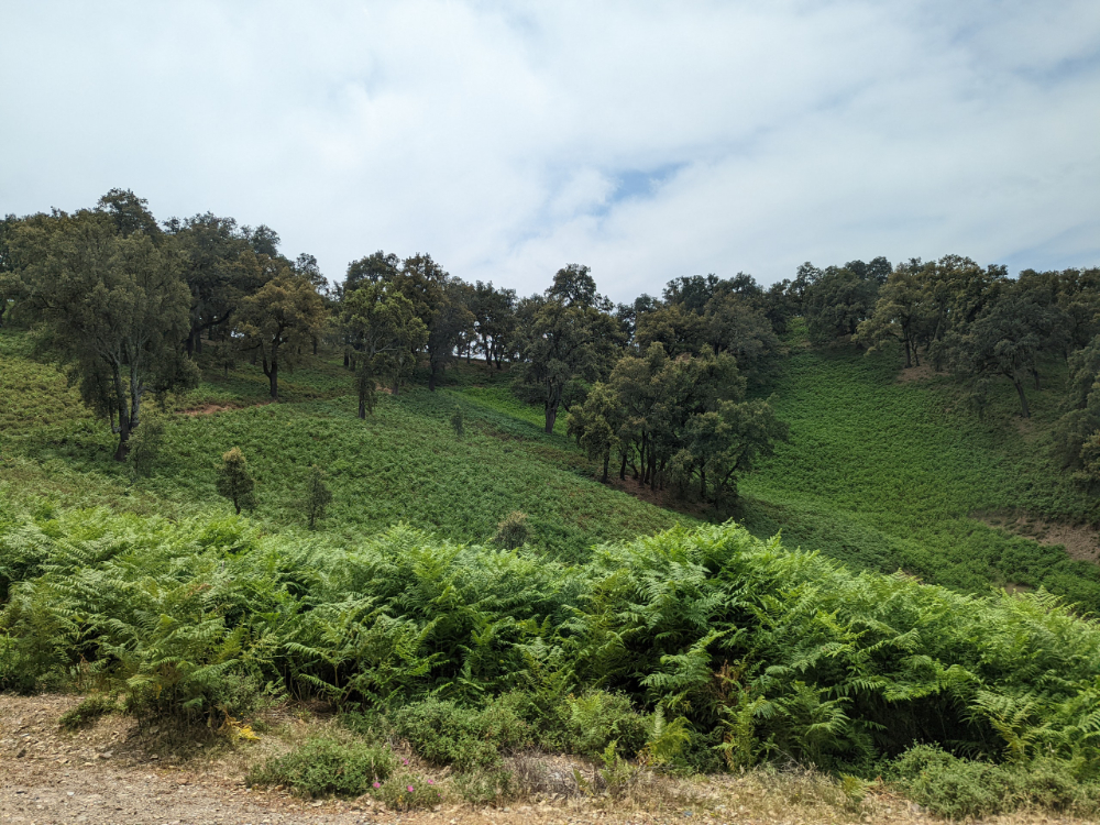 Arrivati in una zona sommitale, cominciamo ad esplorare i dintorni e troviamo fiori di ombrellifere e margherite, oltre che alcune imponenti querce. Del paesaggio mi colpiscono soprattutto i versanti esposti a nord, completamente ricoperti di felci, che crescono rigogliose e su cui torreggiano di tanto in tanto delle sughere, qualcosa che non mi sarei mai aspettato in Marocco.
