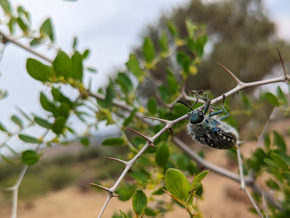 Nessuna traccia della Julodis però e quindi andiamo dalla parte opposta della strada, da dove veniva l’esemplare che abbiamo trovato. Guardando sui fiori troviamo un esemplare e poi un altro, rendendoci presto conto che queste maledette si nascondono tra le spine di questa pianta arbustiva che cresce bassa nel terreno arido. La spcie si rivelerà poi essere Julodis aequinoctialis.