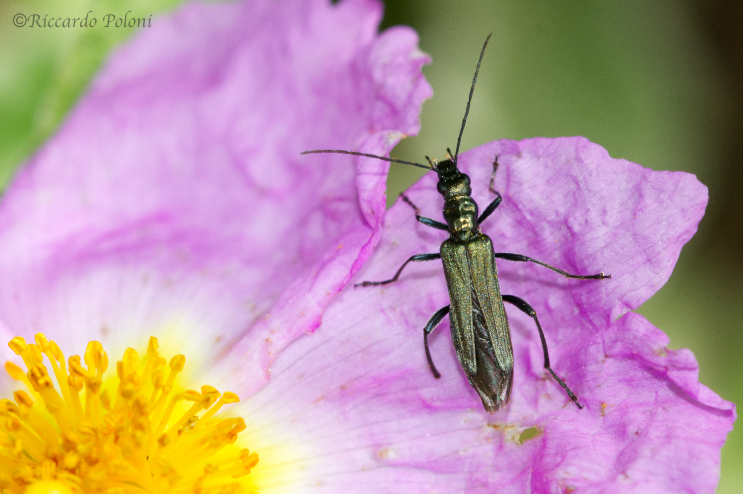 7 giugno Oggi lo dedichiamo al Tiz n'Test. Ci svegliamo abbastanza presto, ma non abbastanza, e scopriamo che insieme a noi nella piccola pensione ci sono un gruppo di 4 entomologi polacchi, tra cui un paio che conoscevo di nome e con cui non ci eravamo mai incontrati. Ma che combinazione! Non hanno però troppa voglia di mangiare insieme e hanno dei ritmi un po' diversi dai nostri, per cui dopo qualche chiacchierata ci lasciamo e loro partono per la caccia prima di noi. A parte noi e i polacchi, l'unico ospite non entomologo è un uomo che sembra abbastanza anziano e che gira il Marocco a piedi per recuperare suppellettili varie da vendere poi ai turisti o almeno è quel che ci racconta. Dopo colazione quindi riprendiamo la macchina per andare a mettere alcuni piattini gialli nella zona dove c'erano i cisti. Ci diciamo "se non ci sono più fiori ce li mettiamo noi!" Arrivati però al prato, troviamo i polacchi già in posizione, per cui per evitare di sovrapporci, cambiamo posto. Una cosa però la notiamo. Il pianoro è letteralmente ricoperto di bellissimi, freschissimi e profumatissimi fiori di cisto rosa. Ovviamente, i fiori con il gran caldo si chiudono nel pirmo pomeriggio, ma il mattino dopo o ne spuntano di nuovi o si riaprono quelli vecchi e la festa ricomincia. Siamo stati degli sciocchi a non pensarci! Poco male comunque, cambiamo leggermente zona e mettiamo i piattini in un altro punto dove i fiori di cisto sono più radi e nel frattempo partiamo su un'altra stradina che scende verso una piccola valle. Lungo questa stradina i cisti non mancano e troviamo in quantità almeno 6 specie di Acmaeodera e 5 specie di Anthaxia, contando solo quelle che capiamo subito essere specie diverse. Stupidamente, concentrato nella raccolta delle rare Oedemera barbara, non ho fatto foto. Verso la fine della mattinata torniamo nel pianoro e cerchiamo anche lì: troviamo qualche Purpuricenus desfontainii desfontainii, alcune altre Acmaeodera e Anthaxia ma soprattutto trovo una piccola serie di Oedemera reini, un endemita dell'Alto Alante, che metto in alcol per future analisi genetiche. La foto che metto qui sul forum dovrebbe essere la prima disponibile sulla rete di questa rara specie. Purpuricenus desfontainii desfontainiiOedemera reiniNel pomeriggio ci dedichiamo alla raccolta della legna e poi a raccogliere i piattini, in cui facciamo davvero un'ottima raccolta. Mai visto così tanta roba andare nei piattini! Alla sera, dopo un'omelette berbera (una frittata cucinata nel piatto di terra cotta del tajin), andiamo a fare la lampada. La serata è perfetta e questa volta accendiamo proprio al passo del Tiz n'Test, vicino alla foresta e in una zona ben riparata. Mai viste così tante tipule! Arrivano anche i solifugi Scorpioni in abbondanza e altre creature, come questi onischi, abbondanti lungo la strada. Giravano anche diverse Calosoma sycophanta, soprattutto sotto gli alberi (e sugli alberi, in effetti), in cerca di bruchi Ovviamente, anche i Tenebrionidae non mancavano, anche se mi apsettavo di vederne molti di più in questo viaggio. Qui uno Scaurus La serata si è conclusa con niente di che, tranne Mauro che, mentre io e Lucio facevamo un giro di perlustrazione, ha acchiappato un Alocerus marcoi.