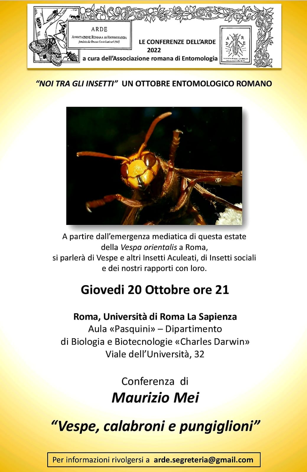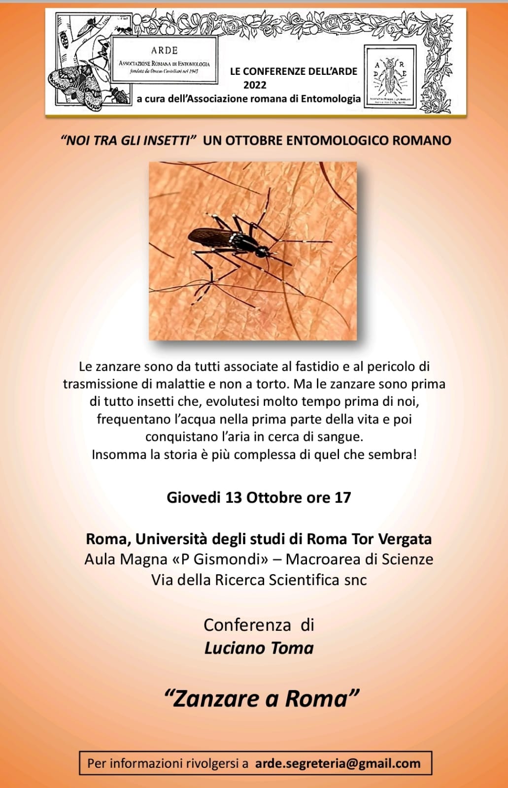 L'Associazione Romana di Entomologia (ARDE) presenta il primo di quattro incontri per raccontare gli insetti ad un pubblico generale. Tratteremo argomenti importanti e diversificati ma anche di stretta attualità e lo faremo con linguaggi e argomentazioni accattivanti. Le conferenze, inserite nel programma generale dell'Ottobre Entomologico "Noi tra gli Insetti" saranno ospitate nelle tre grandi università romane. Più saremo e più interessante sarà la discussione.